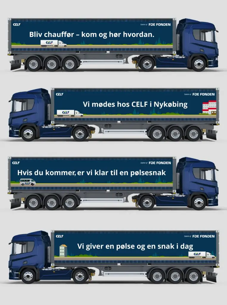 For CELF har jeg haft fornøjelsen af at designe en række store bannere til deres lastbiler, med fokus på at skabe opmærksomhed omkring chaufføruddannelsen.