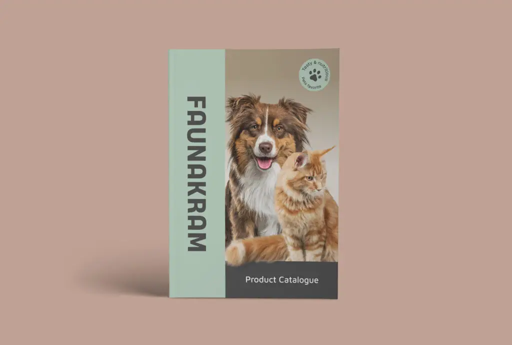 For Faunakram har jeg designet et omfattende produktkatalog, der præsenterer deres brede sortiment af foder og snacks til hunde og katte.